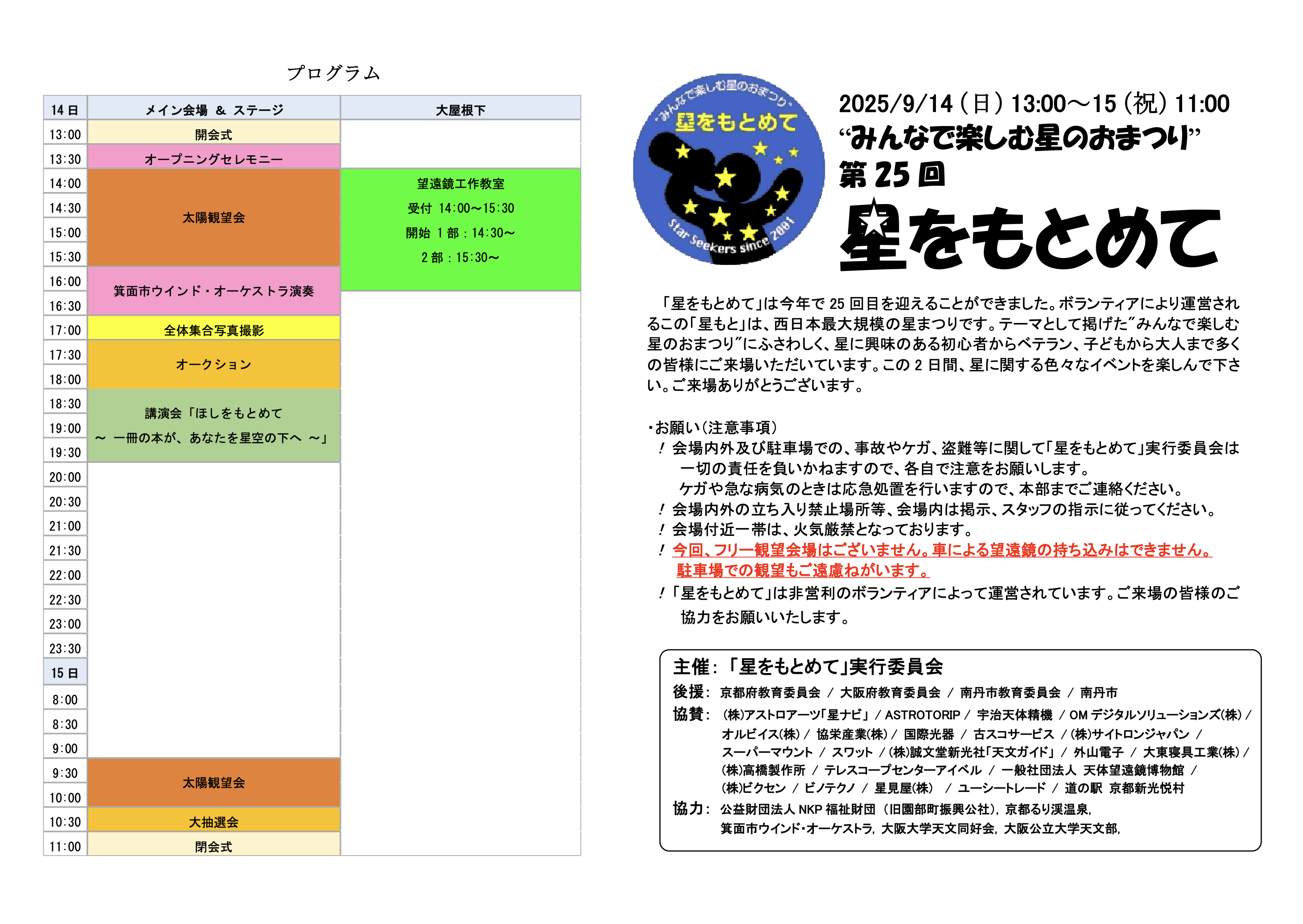 - 天文グッズ販売・配布… 協賛店ブース、オークション、大抽選会