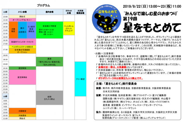 協賛 (株)アストロアーツ「星ナビ」/ASTROTORIP / 宇治天体精機 / OMデジタルソリューションズ(株) / オルビイス(株) / (株)協栄産業 / 国際光器 / (株)サイトロンジャパン / スーパーマウント / (株)誠文堂新光社「天文ガイド」 / 外山電子 / 大東寝具工業(株) / (株)高橋製作所 / テレスコープセンターアイベル / (一社)天体望遠鏡博物館 / (株)ビクセン /ビノテクノ / 古スコサービス / 星見屋 / ユーシートレード / ユニテック(株)